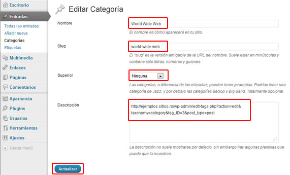 Una vez realizados los cambios se debe hacer click en «Actualizar categoría» para guardar los cambios.